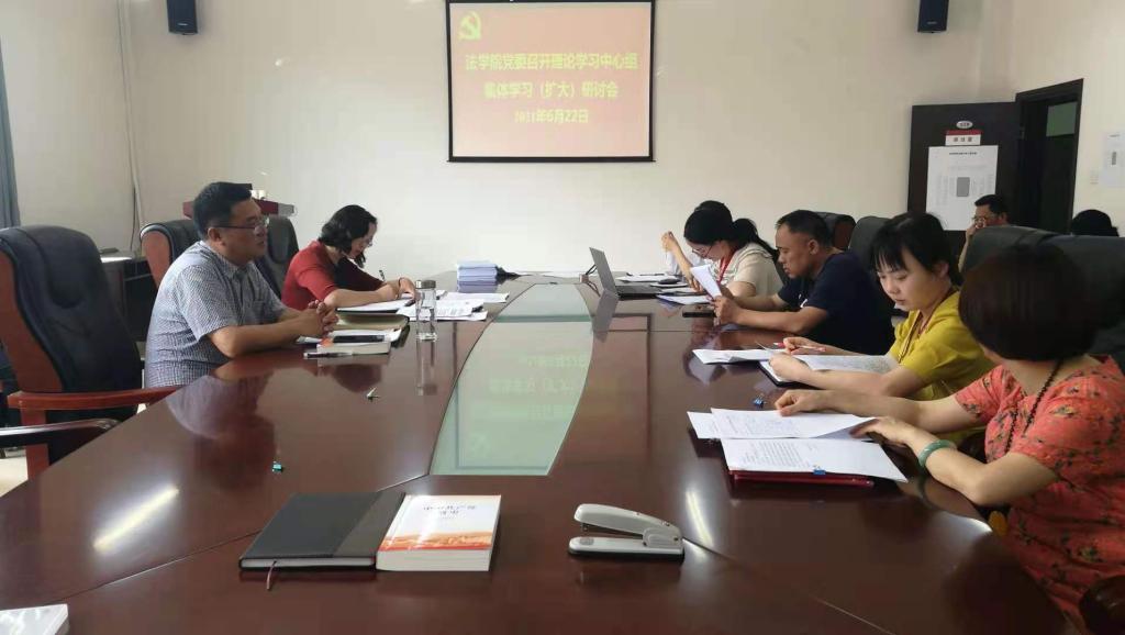 (院党建中心宣传部 报道|摄影 张伟)6月22日下午,法学院党委理论学习中心组在文德楼A8-310会议室组织召开“深刻铭记中国共产党百年奋斗的光辉历程(四)中国特色社会主义新时代(实现巩固拓展脱贫攻坚成果同乡村振兴有效衔接)”专题(扩大)研讨会。学院领导及全体行政人员、支部书记参加会议。学院党委书记詹伟主持会议。