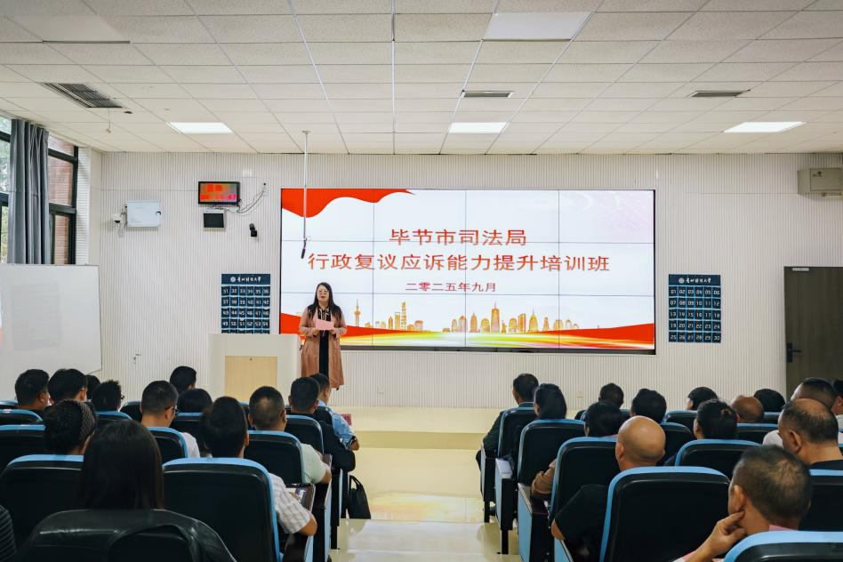 (法学院 王紫微 图文报道)为深入贯彻落实新时代全面依法治国战略部署,进一步提升毕节市行政执法人员的专业素养与履职能力,推动法治政府建设向纵深发展,9月23日,由毕节市司法局主办、华体会官方网页版_华体会(中国)承办的“毕节市2025年度行政复议应诉能力提升培训班”开营仪式在华体会官方网页版_华体会(中国)乐学楼阶101教室成功举行。毕节市司法局党组成员、副局长罗培栋,法学院党委书记邵新顺,法学院党委委员、副院长(主持工作)曹务坤,副院长宋昭澜,产教融合中心副主任王霖、任红出席,毕节市各行政部门 60 余名行政执法人员参加了开营仪式。仪式由宋昭澜主持。