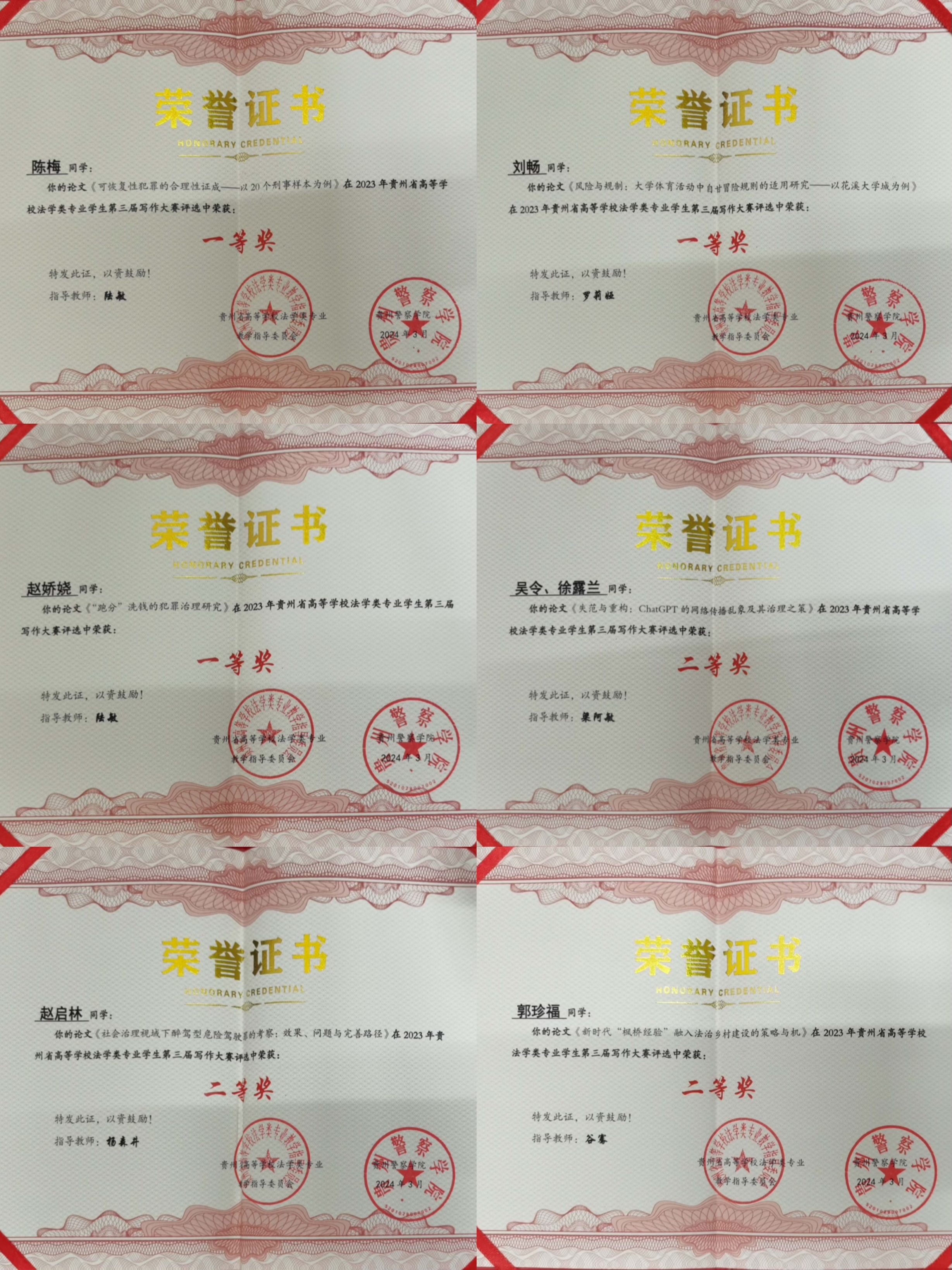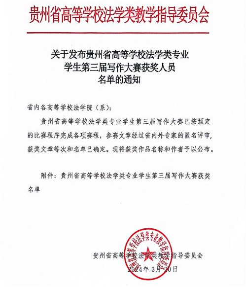 (法学院 图文/报道 陆敏)秉承华体会官方网页版_华体会(中国)“学术立校”理念,法学院鼓励老师积极指导学生参赛,近日,法学院本科生在2023年贵州省高等学校法学类专业学生第三届写作大赛中取得佳绩,共有20篇论文获奖。其中,一等奖3项、二等奖5项、三等奖5项、优秀奖7项,获奖论文数量在省内高校中排名第二,同时也是法学院本科生连续参加三届比赛以来取得的最佳成绩。