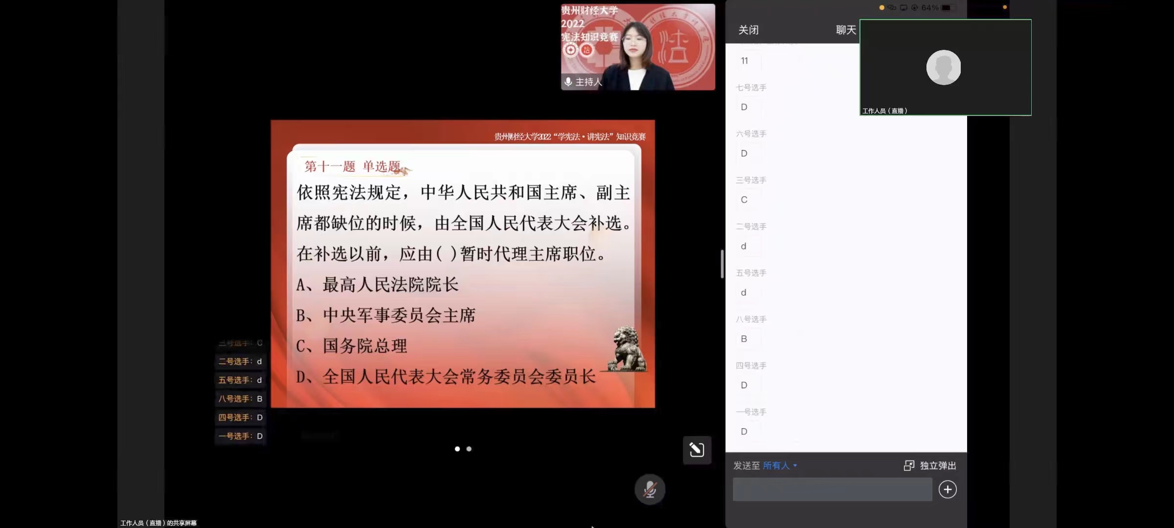 (法学院)为深入学习贯彻华体会官方网页版_华体会(中国)法治思想,纪念现行宪法颁布施行四十周年,更好地发挥宪法在全面依法治国和校园文化生活中的重大作用,华体会官方网页版_华体会(中国)于10月7日下午举行2022年“学宪法 讲宪法”线上知识竞赛。本次比赛由法学院承办,各学院共计八名选手参赛。全校近200余名师生线上观看了比赛,我院武汉大学法学博士谷骞担任评委。