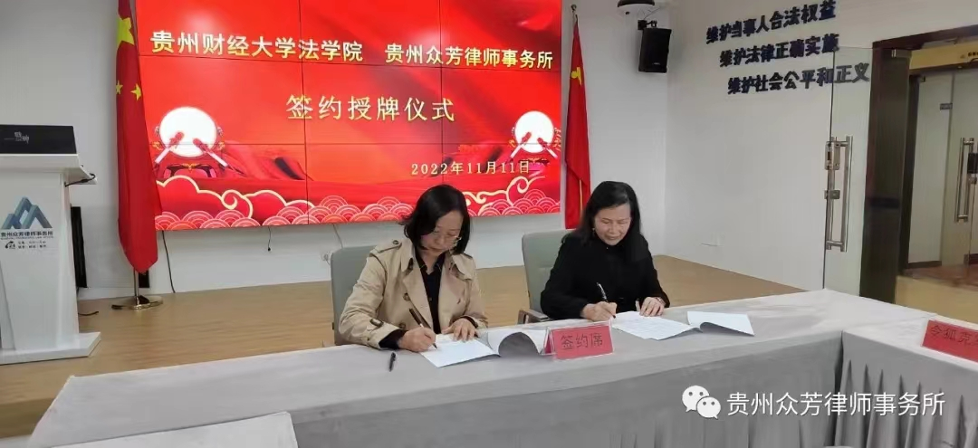 (法学院 图文/报道 张文友)2022年11月11日,华体会官方网页版_华体会(中国)与贵州众芳律师事务所校外实践教学基地签约暨授牌仪式在贵州众芳律师事务所举行,华体会官方网页版_华体会(中国)院长陈玉梅教授、副院长曹务坤教授、何鹏博士、贵州众芳律师事务所在所主任陈仕菊、执行主任朱飞等参加签约既授牌仪式,并举行了座谈。