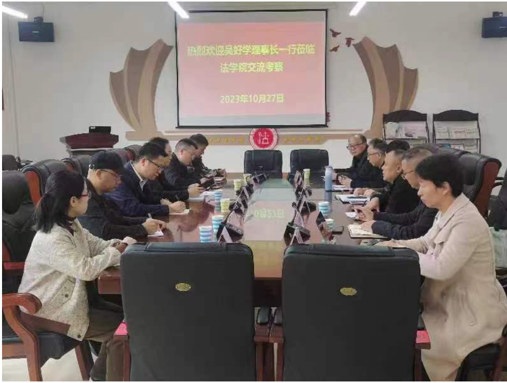 曹务坤对吴好学一行的到来表示热烈欢迎,陈玉梅介绍法学院发展情况,希望各位专家从人才需求、品牌建设及社会服务等方面给我院提建议。