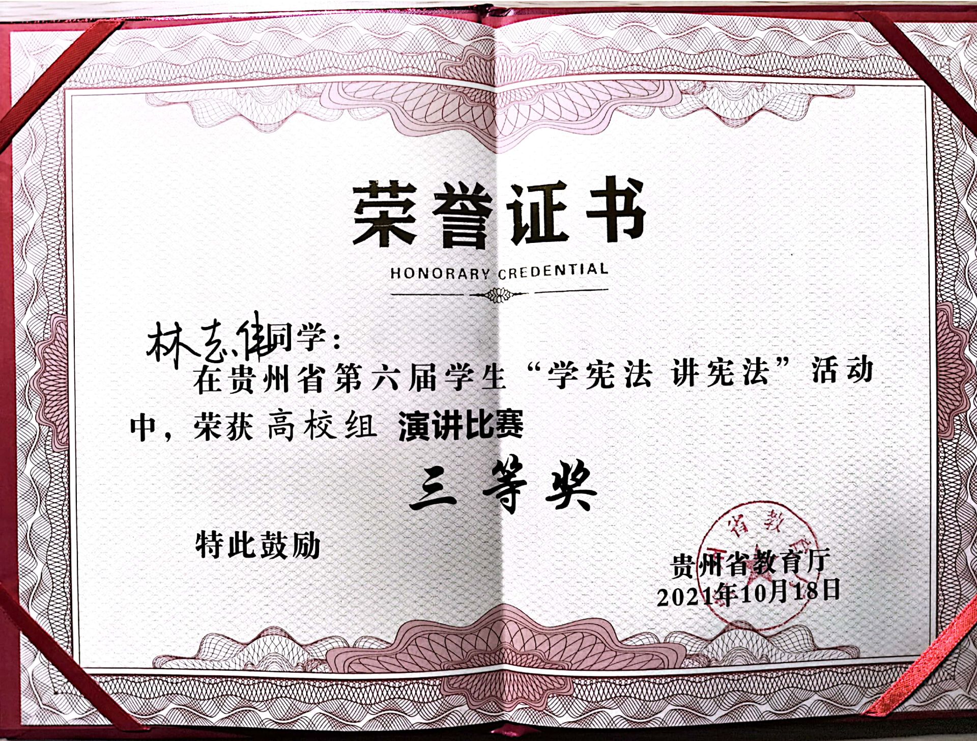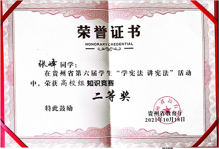 10月18日,由省教育工委、省教育厅主办,贵州民族大学承办的全省第六届学生“学宪法 讲宪法”活动总决赛在贵州民族大学举行,华体会官方网页版_华体会(中国)法学院学子张峰、林志伟经过多轮激烈比拼后,晋级总决赛,同来自全省各高校的参赛选手进行角逐。最终张峰同学荣获知识竞赛二等奖,林志伟同学荣获演讲比赛三等奖。