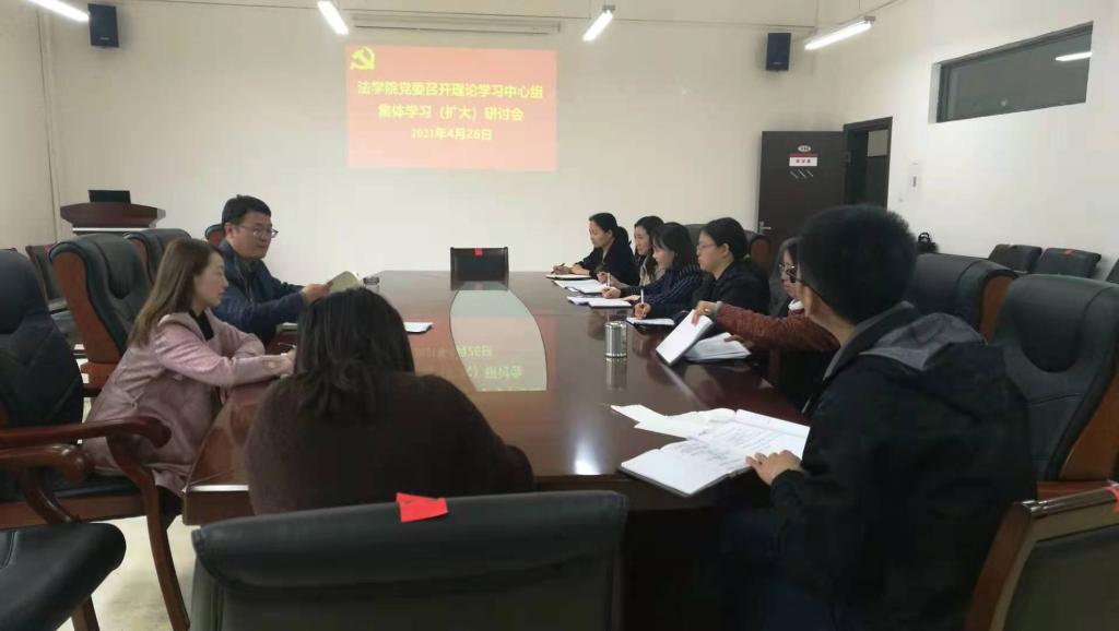 (金方雨 图文报道)4月26日下午,法学院党委理论学习中心组在文德楼A8-310会议室召开2021年度第四次集体学习暨深刻铭记中国共产党百年奋斗的光辉历程专题(扩大)研讨会。学院领导及全体行政人员、支部书记参加会议。学院党委书记詹伟主持会议。